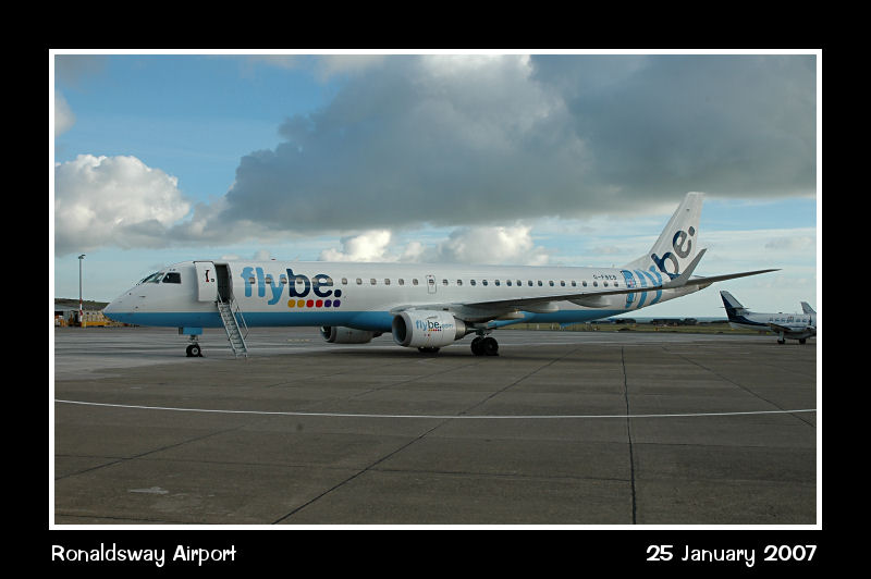 Second of the FlyBe ERJ195s to visit Ronaldsway, G-FBEB is parked on the edge of the west apron