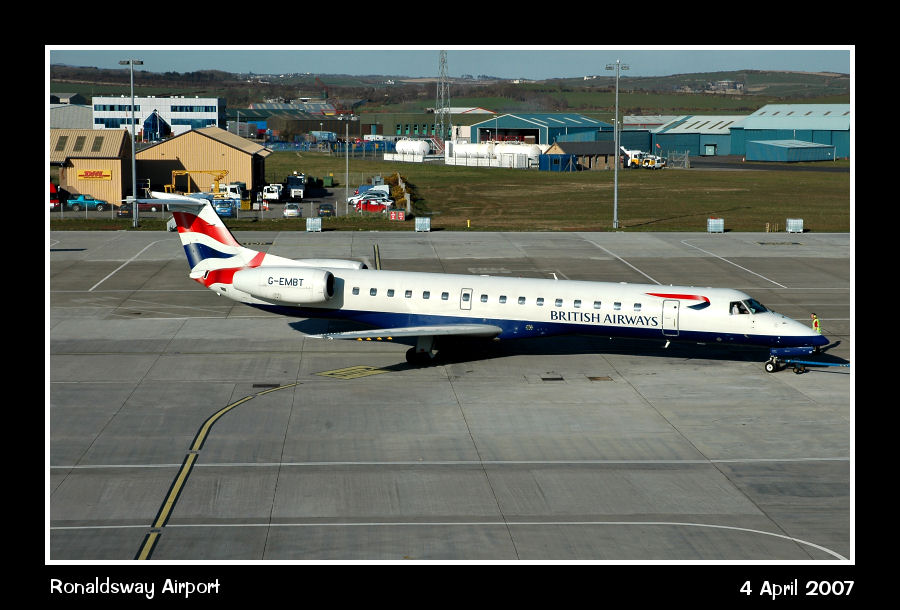 FlyBe ERJ145, G-EMBT in BA colours. These aircraft are presently the mainstay of the FlyBe Manchester and Birmingham routes