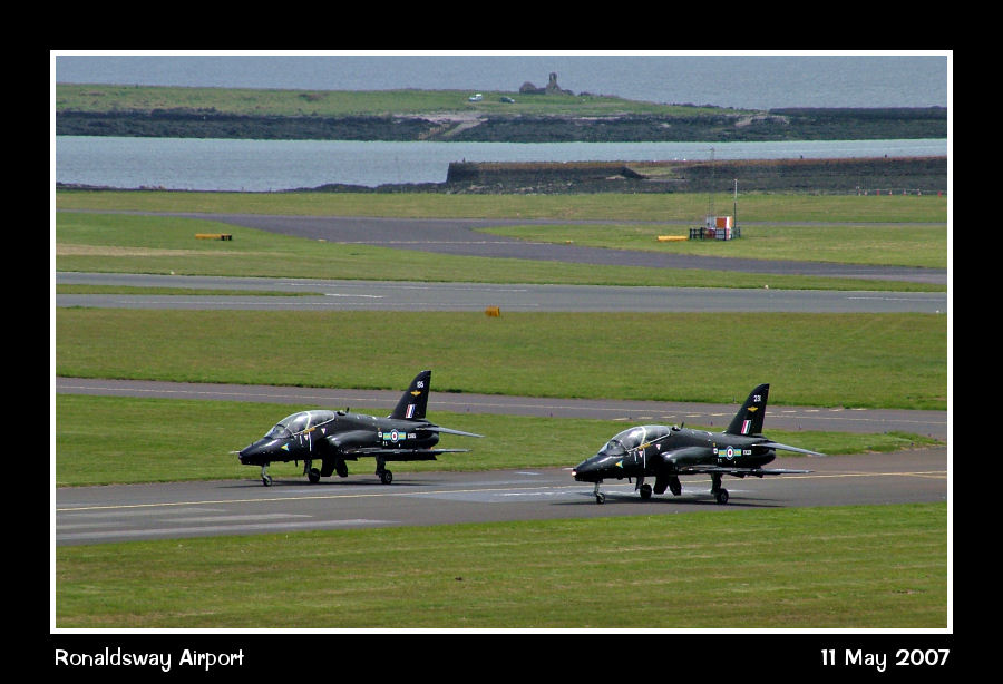 RAF 208 Sqn Hawks, XX195 & XX231, hold on taxiway Foxtrot, to resolve a minor problem before departing to RAF Valley