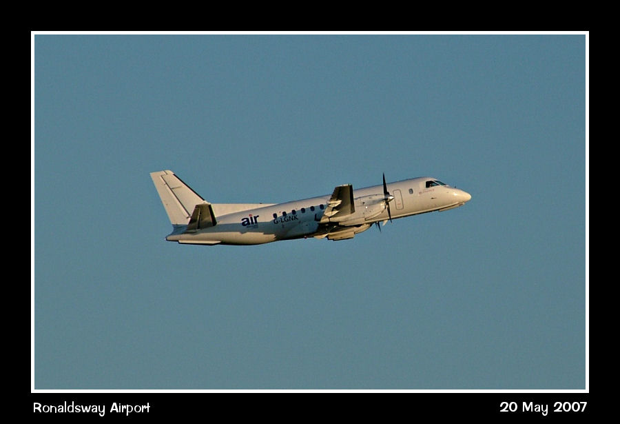 Loganair Saab 340B, G-LGNK, climbs our steeply after departure