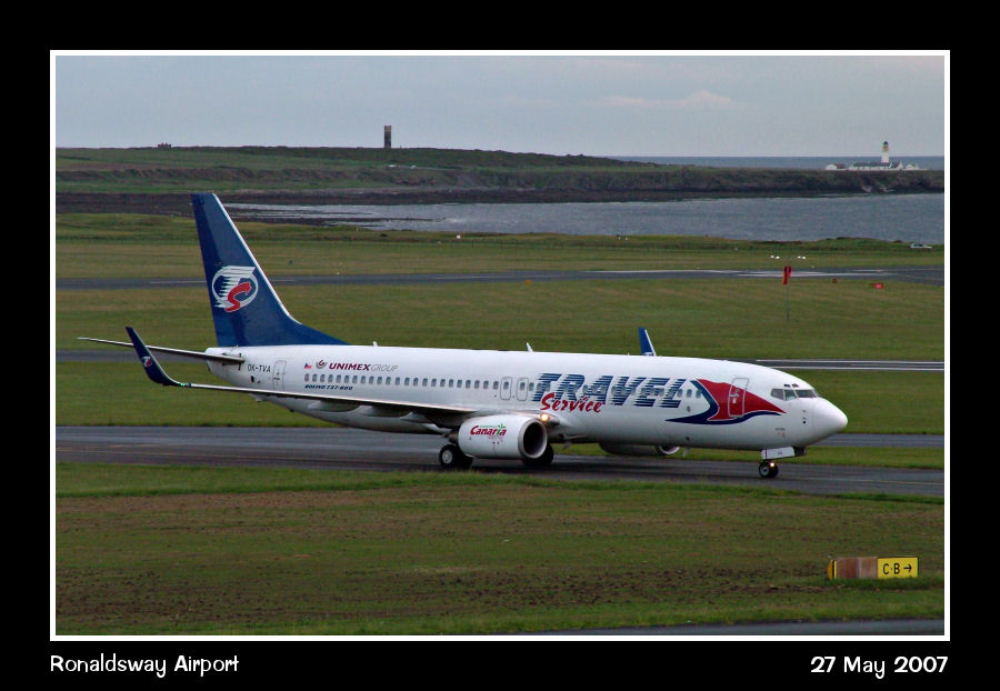 Travel Service Boeing 737-800, OK-TVA, taxies in to operate a charter flight to Italy