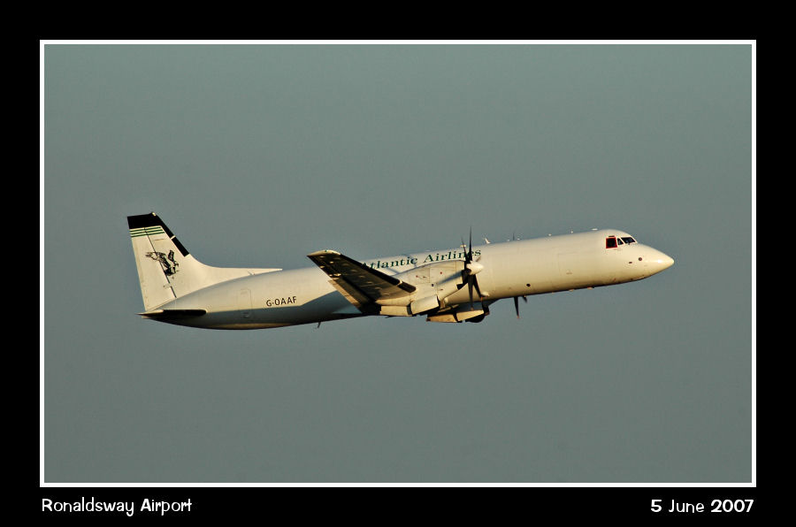 Atlantic Airlines ATP, G-OAAF, climbs out in the evening sun on the mail flight to East Midlands