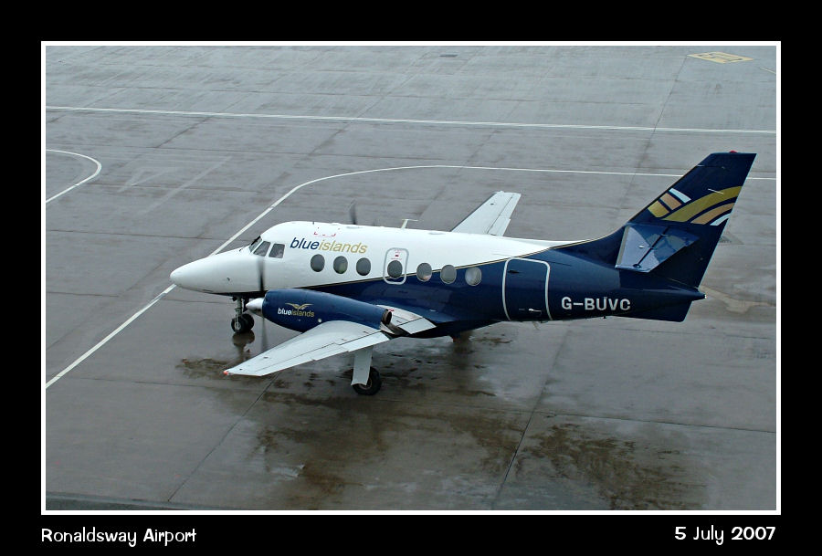 Wearing what looks like an interesting combination of Eastern and Blue Islands colours, Jetsream 31, G-BUVC taxies off stand on a wwet afternoon