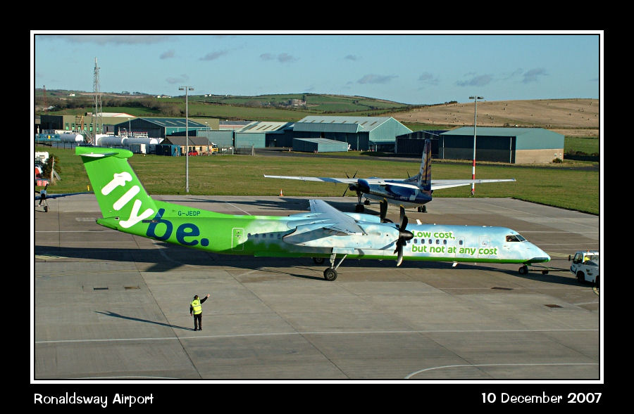 'Green' FlyBe Dash8 Q400, G-JEDP, pushes back for a Birmingham service