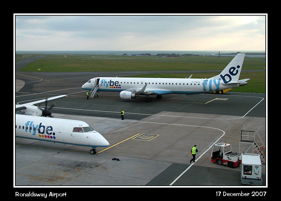Parked 'nose out' on stand 8, FlyBe ERJ195, G-FBEA prepares to disembark passengers as company Q400 G-JECS arrives on the adjoining stand