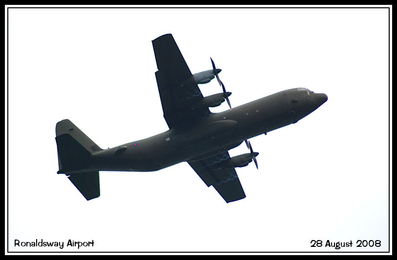 An unidentified RAF C130J Hercules climbs away after a practice approach