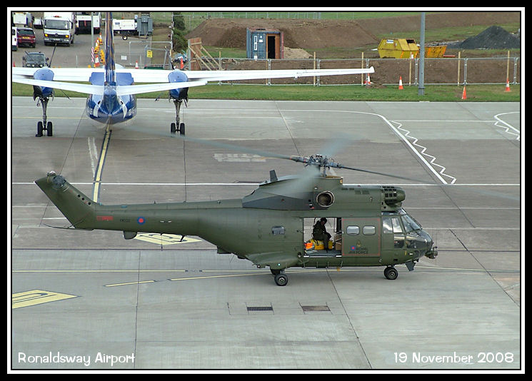 A very smart looking RAF Puma HC1, XW222, taxies out after a refuelling stop at Ronaldsway