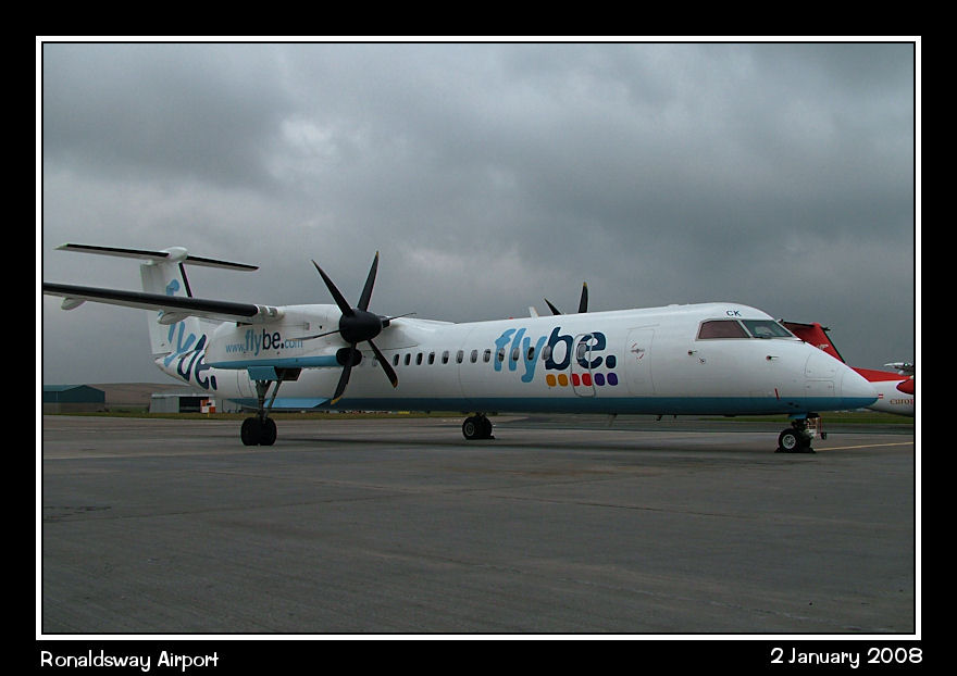 The Dash8-Q400 is the mainstay of FlyBe IOM services. Here G-JECK awaits service