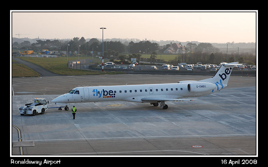 An evening picture of FlyBe ERJ145, G-EMBU, being pushed back on the west apron