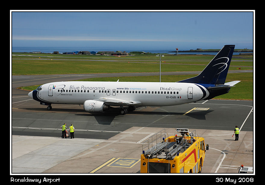 Blue Panorama Boeing 737-400 EI-CUD parks on stand 8 to operate a charter flight to Italy