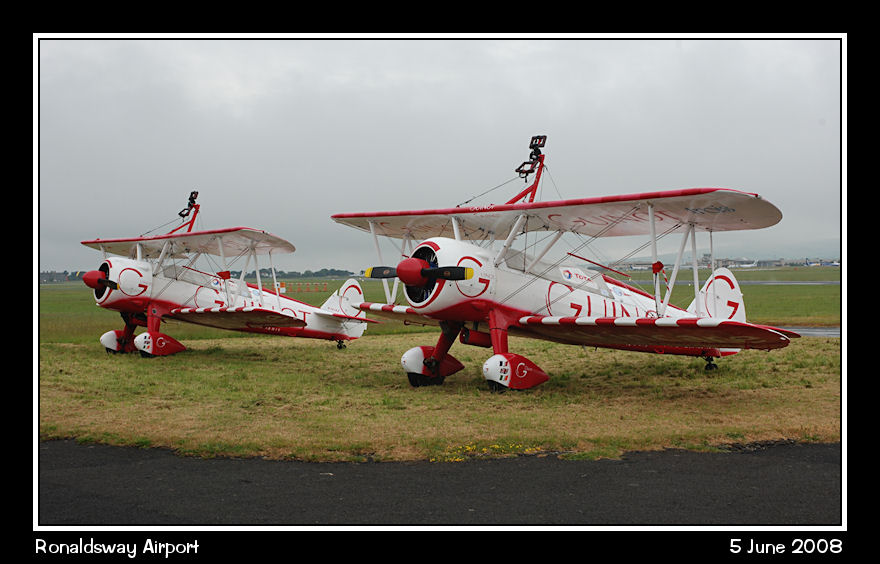 Team Guinot Wingwalkers Boing Stearman parked at Manx Flyers. N707TJ & N74189