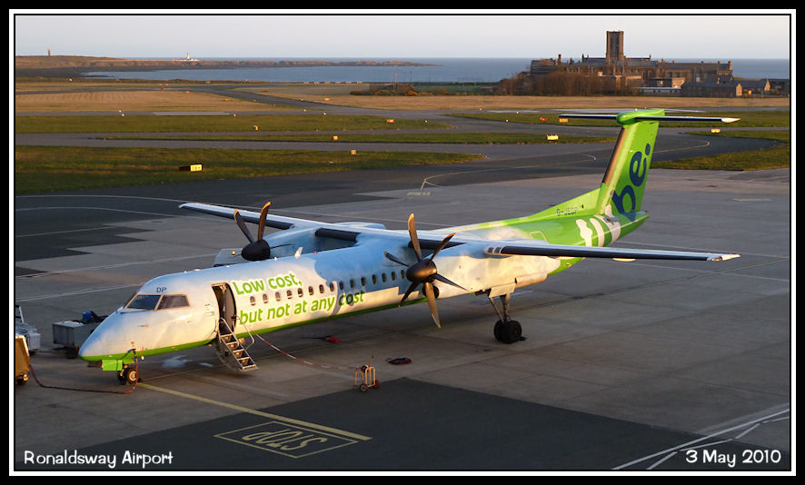 FlyBes 'green' Q400, G-JEDP, in the evening sun after completing the days flights