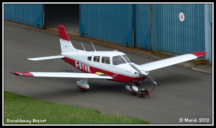 Ronaldsway based Cherokee Archer III G-BYHK stands outside the hanger