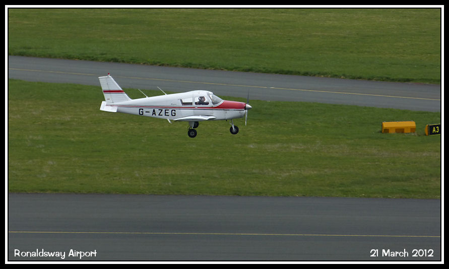 Piper Cherokee G-AZEG from the Ashley Gardner Flying Club about to touch down on runway 21