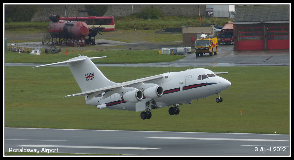 RAF BAe 146 ZE700 takes to the air, passing the airport fire section