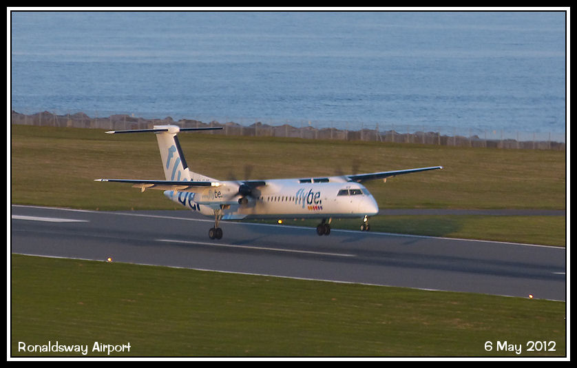 A FlyBe Dash8-Q400 about to touch down on runway 26