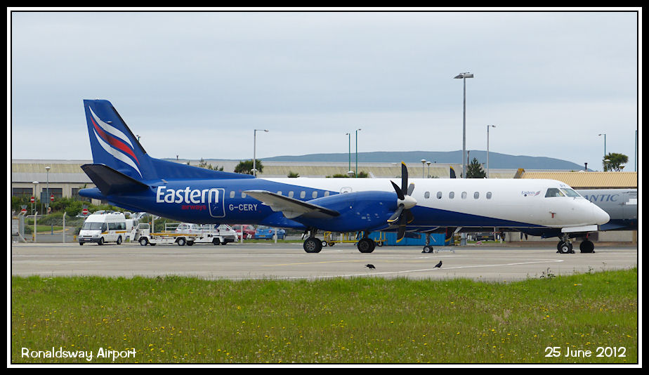 Flown in as a backup aircraft for the London City route, Eastern's Saab 2000 G-CERY parked on stand 13