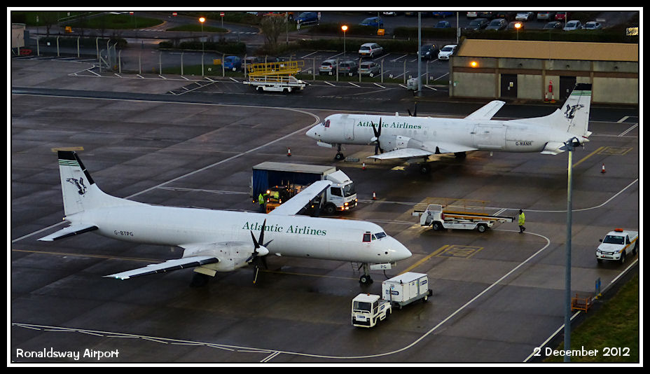 The Sunday newspapers being unloaded from Atlantic Airlines ATP G-BTPG with G-MANH parked behind