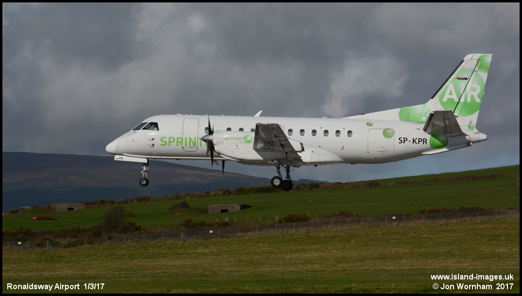 Sprint Air Saab 340 SP-KPR about to touch down on runway 26 at Ronaldsway