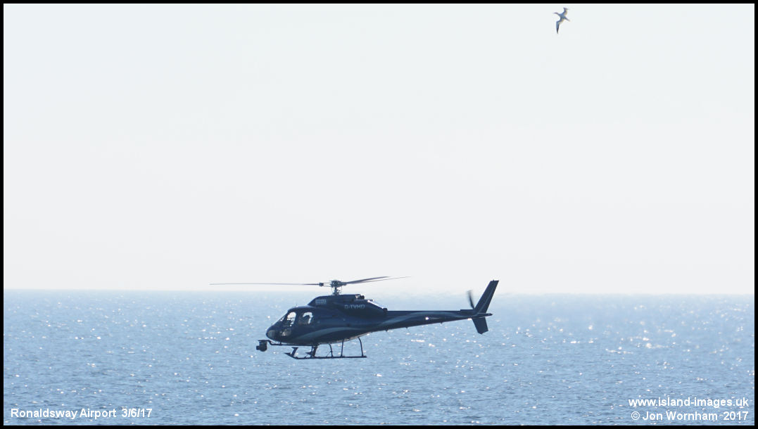 Twin Squirrel G-TVHD is off to film a TT practice session, passing underneath a gannet!