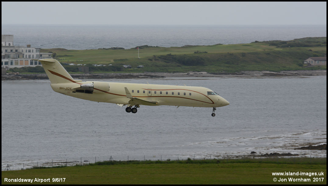 CRJ200 9H-JOY about to land on runway 26 with Derbyhaven Bay as backdrop