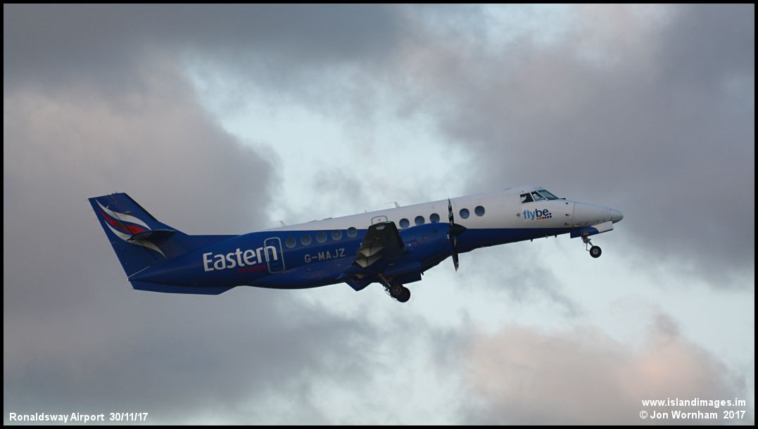 Eastern Airways Jetstream 41 G-MAJZ climbas away from Ronaldsways runway 08, sporting FlyBe titles on ots nose.