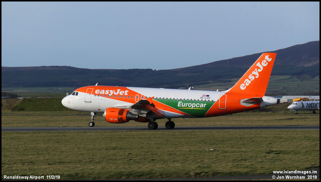 With Europcar advertising on the fuselage, Austrian registered EasyJet Airbus A319 OE-LQY pictured after landing on runway 26 operating a flight from Liverpool.