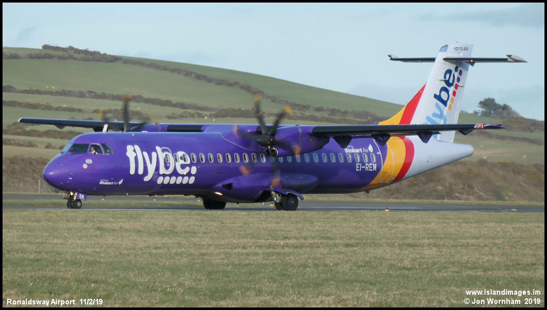 Stobart Air ATR72 EI-REM rolls on runway 26 at Ronaldsway. The Stobart ATRs are scheduled to operate until the end of March, when FlyBe will operate the services themselves with Dash8-Q400s again.