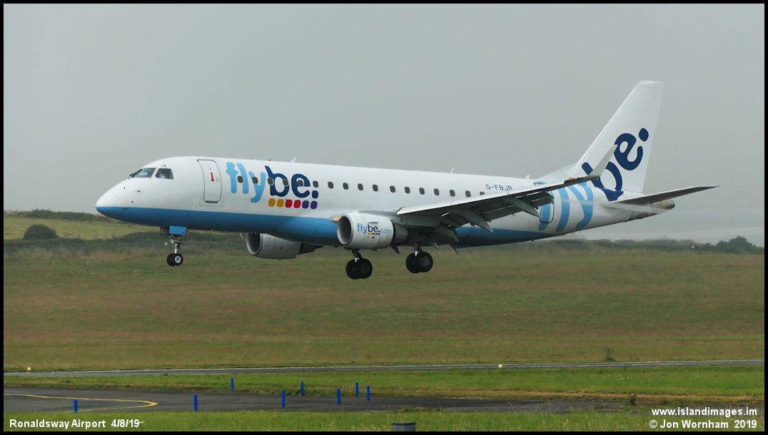 FlyBe Embraer ERJ175 G-FBJB over the threshold of runway 26 after emerging from the low cloud on short final, inbound from Birmingham.