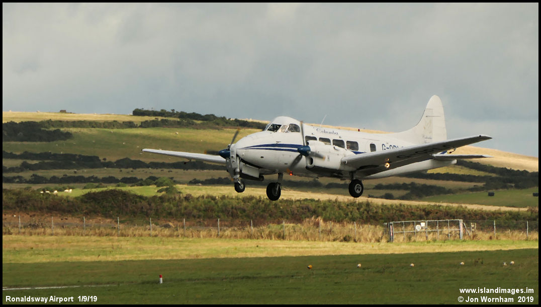 De-Havilland Dove G-OPLC pictured over the threshold of runway 26 arriving from Fairoaks.