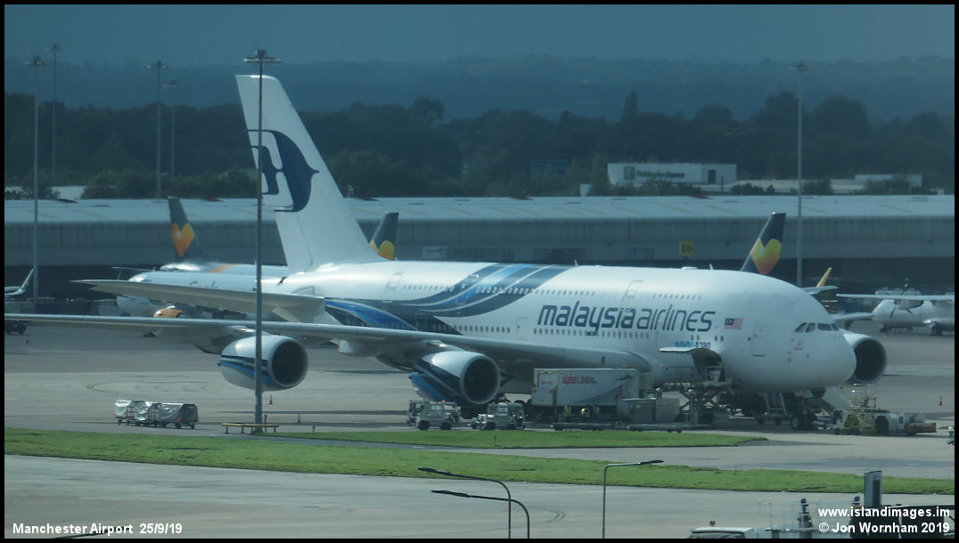 Shot at a distance through a hotel window - Malaysia Airlines Airbus A380 9M-MNF was at Manchester operating passenger recovery flights after the collapse of Thomas Cook Airlines.