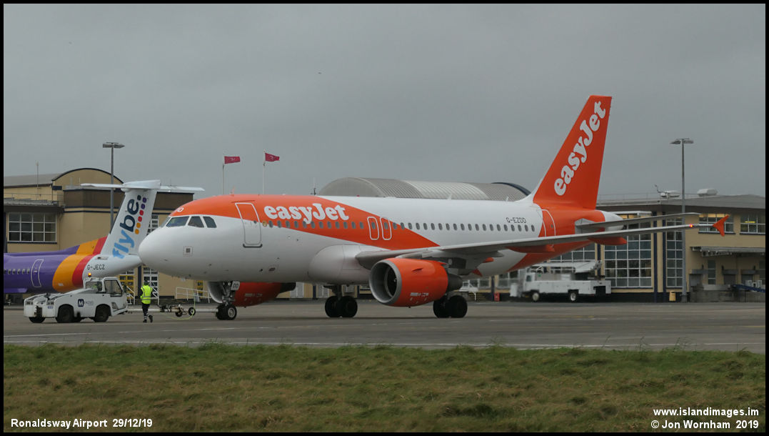 EasyJet Airbus A319 G-EZDD completing pushback on the east apron at Ronaldsway, operating a Liverpool flight.