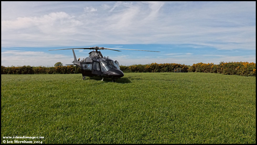 Driving near Ballaugh, I came across Agusta A109 G-FGRP parked in a field. Chatting with the pilot I found that it had brought sombody across from the UK for a motorsport event.