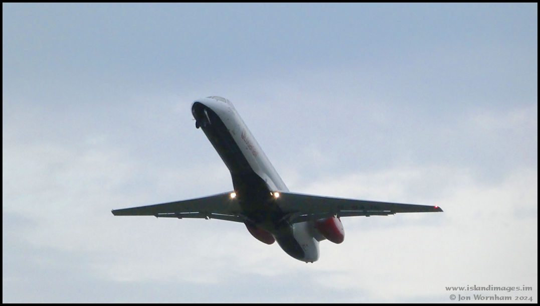 With the undercarriage retracting, Loganair's G-SAJS climbs away, heading for Edinburgh.