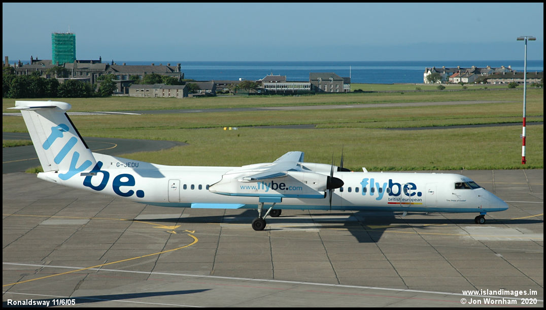 Dash8 Q400 G-JEDU taxies in on the west apron. This aircraft was delivered new in 2004 and was still in service in 2020, repainted into the later purple scheme,