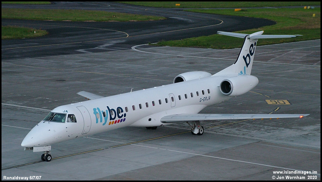 An all white ERJ145 with FlyBe titles. G-ERJA was operated until 2009 and appears to have been in storage since then, unless broken up.