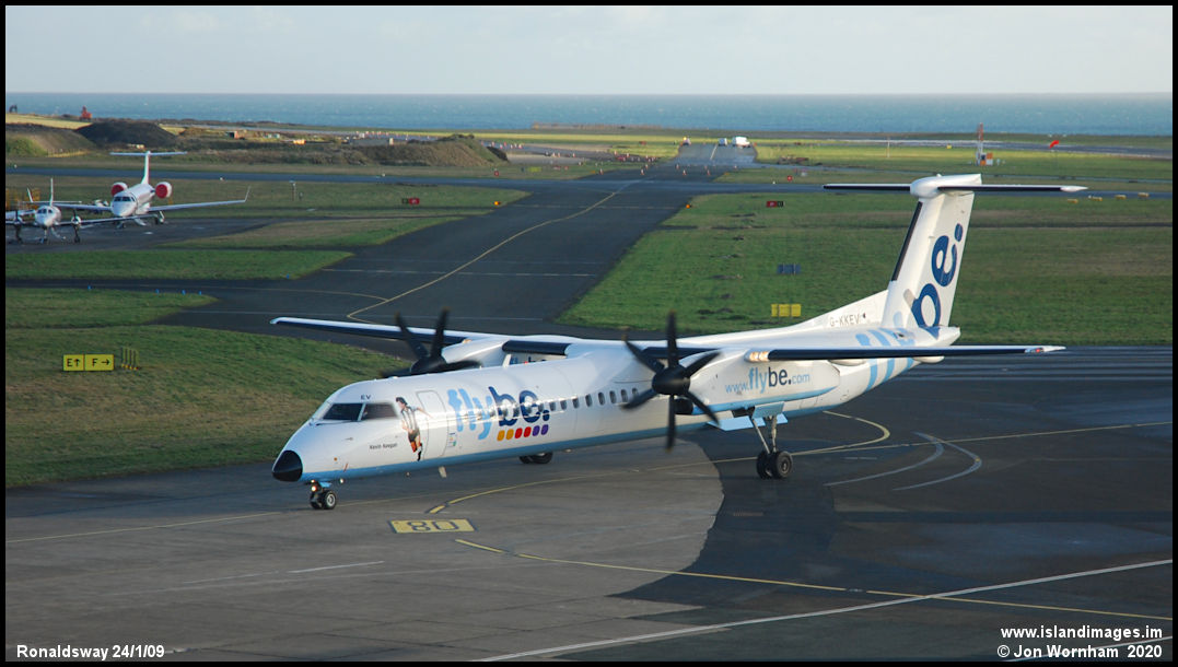 Out of sequence registration G-KKEV, 'Kevin Keegan' arrives on the east apron at Ronaldsway. Delivered in 2008 and still in the fleet in 2020.