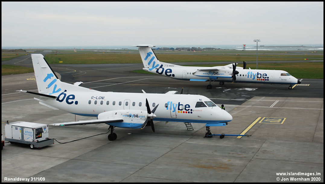 Loganair Saab 340B G-LGNI on stand 9 with Q400 G-KKEV behind.