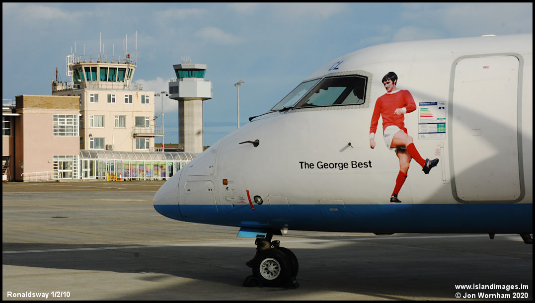 Nose art on G-JECL 'The George Best' with Ronaldsway's new control tower structurally completed behind the 1944 one. Aircraft still in the fleet in 2020.