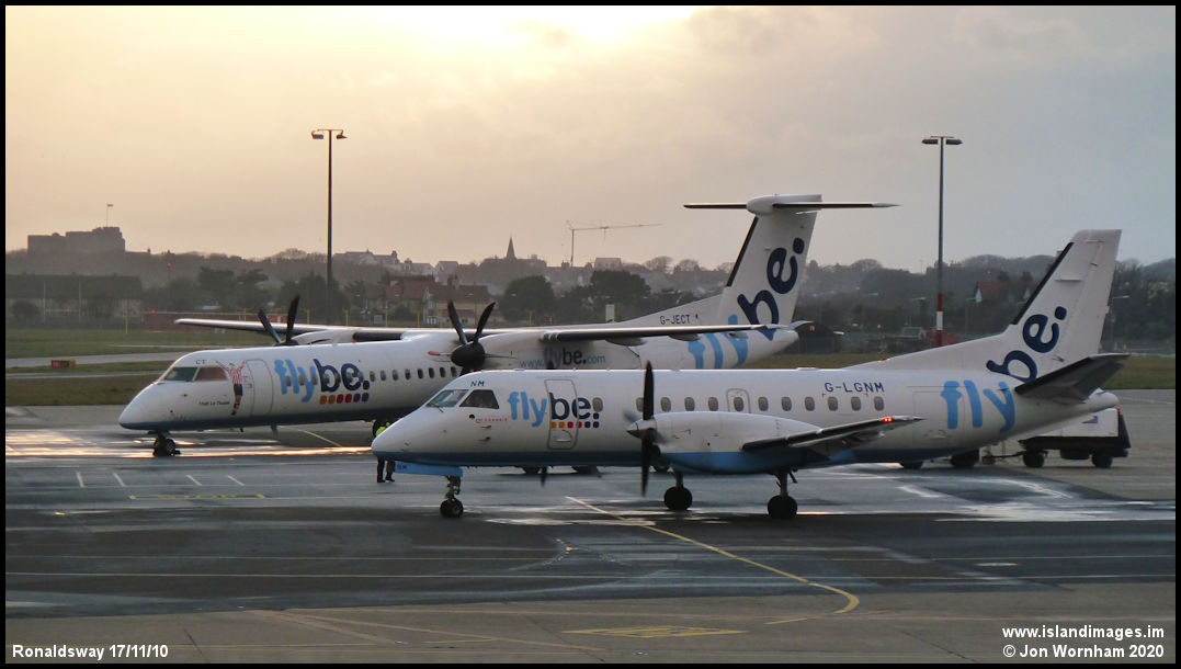 A late Winter afternoon shot with Loganair Saab 340B G-LGNM about to taxy and FlyBe Q400 G-JECT parked remotely, probably either a back up aircraft or unserviceable. 'CT left the fleet in 2011 and went to South African Express as