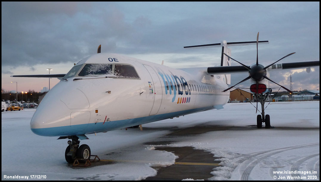With just a path cleared to its door, Q400 G-ECOE sits in the snow on the east apron. Delivered in 2008 it had periods of operation for Wideroe in Norway as