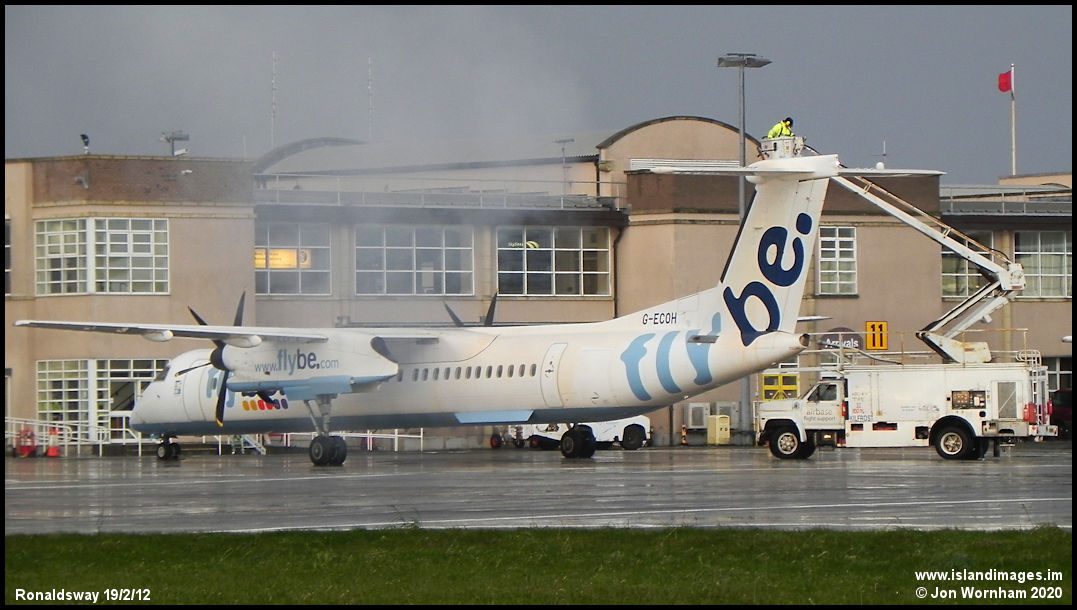 Q400 G-ECOH is de-iced on a frosty February morning. This aircraft joined the fleet in 2008 and was still in service in 2020.