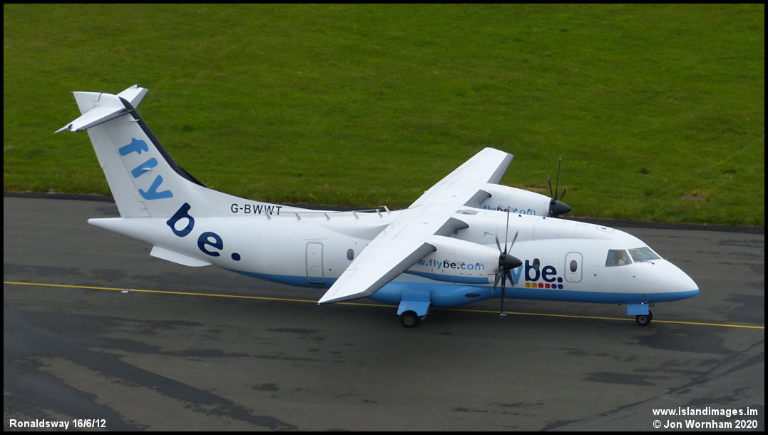 Another type to appear in FlyBe colours were the Suckling Airways Dornier 328s, operating for Loganair. They flew a Norwich to Ronaldsway route for a while. G-BWWT is pictured taxiing in after arrival.