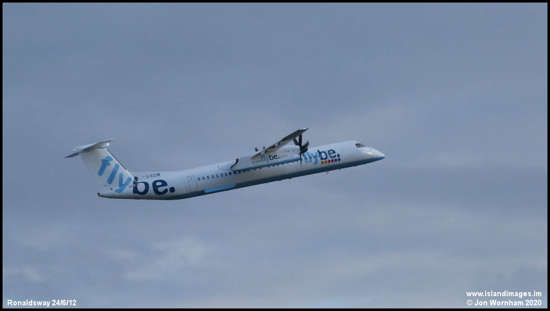 Dash 8 Q400 G-ECOM climbing away from Ronaldsway. Joining the fleet in 2008 it was still in service in 2020.