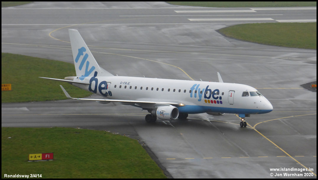 ERJ175 G-FBJE taxies from 'Alpha' onto 'Foxtrot', viewed from the control tower. New in 2012 it was still in the fleet in 2020.