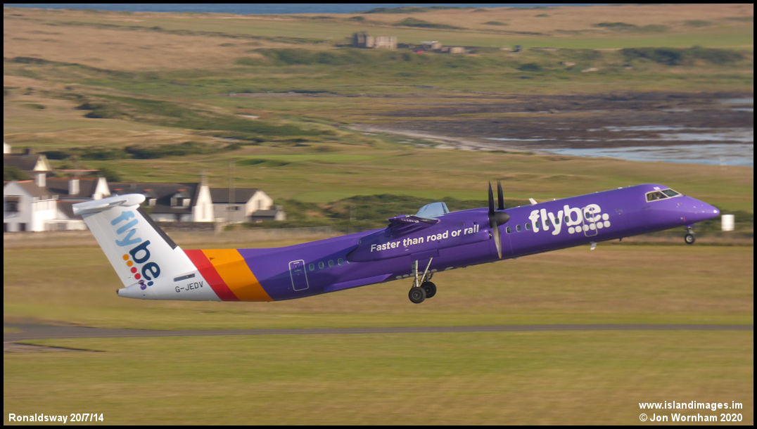 Purple liveried Q400 G-JEDV climbs rapidly away from runway 26 on a summer's afternoon.