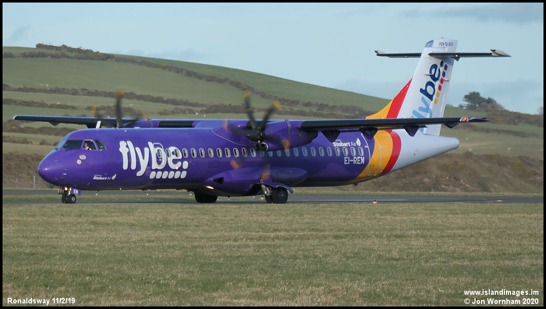 Sobart Air ATR72 EI-REM rolls on runway 26. This aircraft made its last flight for FlyBe on the 30th March 2019 and was last reported as RP-C7858 with SkyJet Airlines in the Philippines.