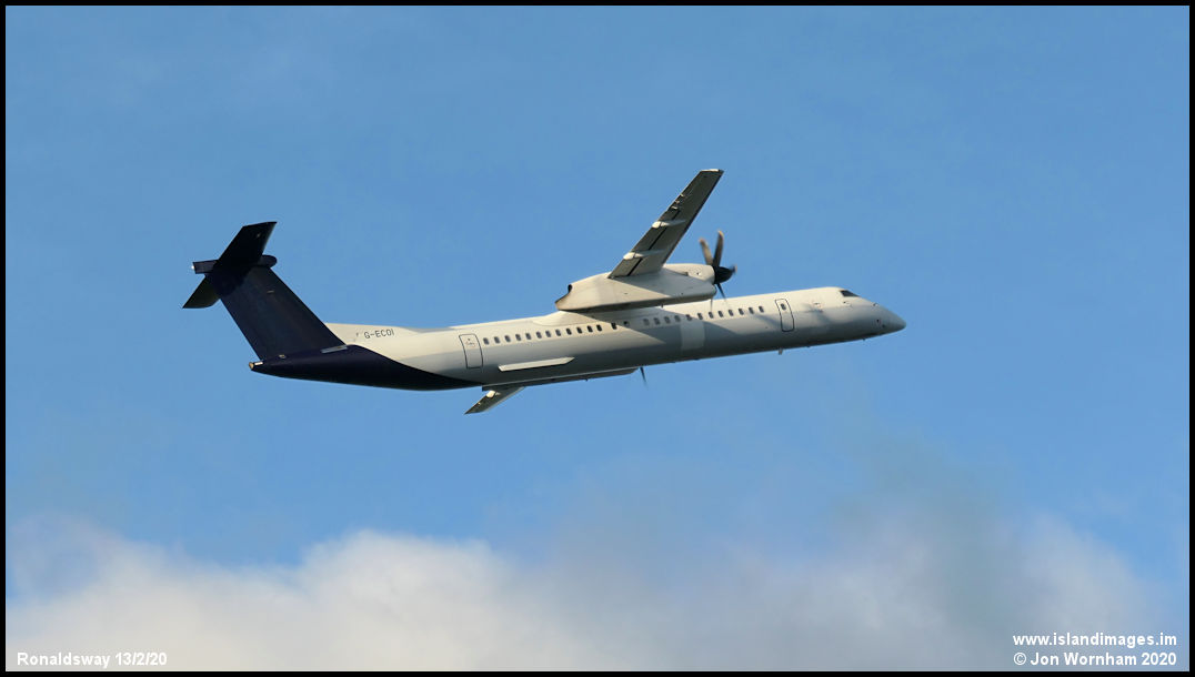 Q400 G-ECOI climbs away from Ronaldsway. Still painted in basic Brussels Airlines colours over two years after that contract ended. Surely this aircraft should have been a candidate to Virgin Connect colours?