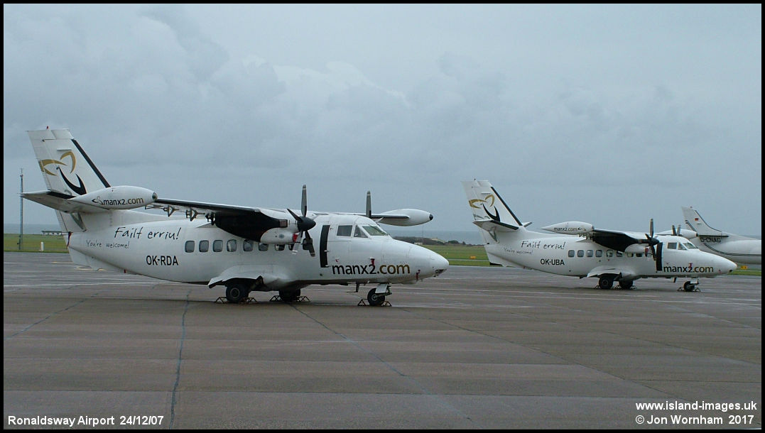 January 2007 and LET410s OK-RDA and OK-UBA are parked between Manx2.com flights, on the west apron at Ronaldsway in December 2007. OK-UBA has had its tip tanks re-fitted.