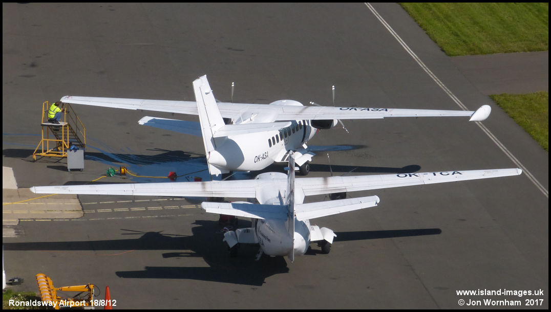 Looks like OK-ASA has just arrived back after maintenance. Painted in plain white outside the Manx2 hanger having tip tanks removed. OK-TCA keeping it company in August 2012.